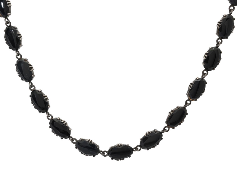 MOURNING JEWELLERY, necklace, silver, onyx, turn of the century, length 42 cm, weight 20,7 g, some stones in lighter shade.