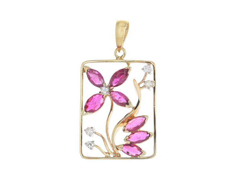 PENDANT, 14K gold, marquise cut rubies, brilliant cut diamonds approx., approx., height 38 mm, weight 2,8 g, the rubies has damages and worn facet edges.