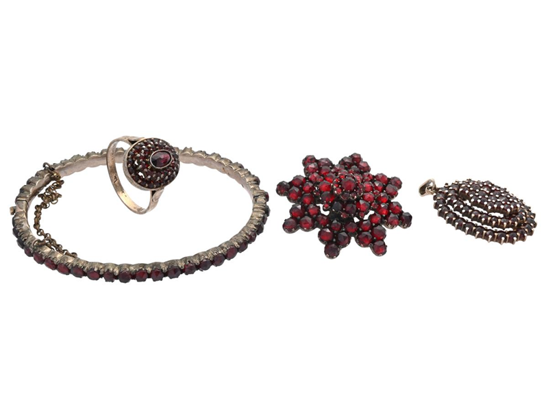 SET OF JEWELLERY, ring and pendant, silver, brooch and bracelet, yellow metal, garnets, weight 30,5 g, bracelet missing one stone.