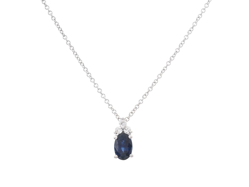 CHAIN WITH PENDANT, 18K white gold, oval-cut sapphire approx. 0,65 ct, brilliant cut diamonds approx. 0,06 ct, approx. W-TCr/ SI-P, length 40 cm, height 0.9 cm, weight 1.9 g, small notch on the sapphire.