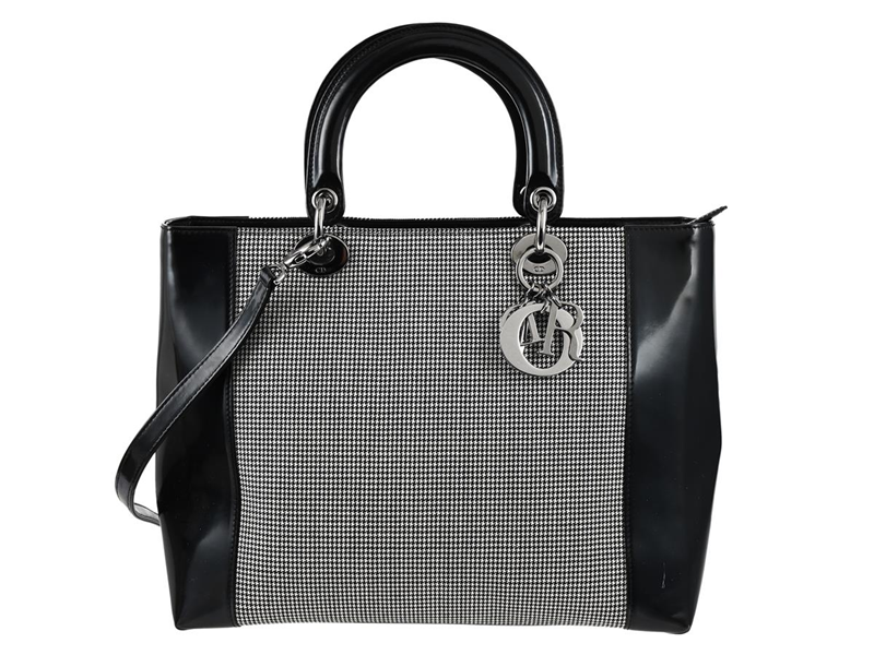 BAG, CHRISTIAN DIOR, Lady Dior Bag, black patent leather, fabric, black, white, silver-tone hardware, 33x25x11 cm, marked MA-0959, year 1999, detachable shoulder strap, dustbag,
