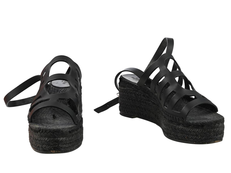 SHOES, HERMÈS, Alicia Espadrilles, black leather, size 37, heel 7 cm, platform 3 cm, dustbag, box.