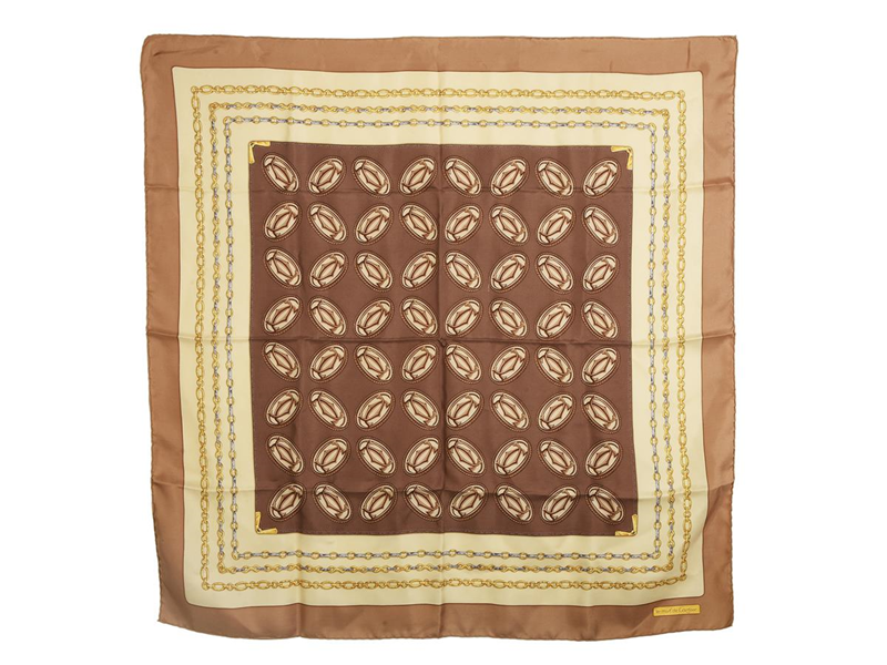 SCARF, CARTIER, 100% silk, 84x84 cm, brown, beige, grey, pulled threads.
