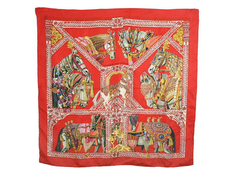 SCARF, HERMÈS, La danse du Cheval Marwari, Annie Faivre, 100% silk, 90x90 cm, red, white, green, pink, pulled threads, stain, case.
