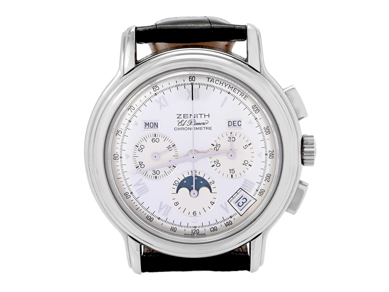 ZENITH, Primero, Chronomaster, Tachymetre, Chronometre, Cal 410, Move no. 116705, Serial no. 10993, Ref no. 01.0240.410, Case no. 01 0240.410, chronograph, men´s wristwatch, 40 mm, steel, self wind, sapphire crystal, day, date, month, moonphase, display caseback, needs overhaul (see detailed info), leather strap, original buckle, chronometercertificate, approx. 2000, box (damaged), paper box.