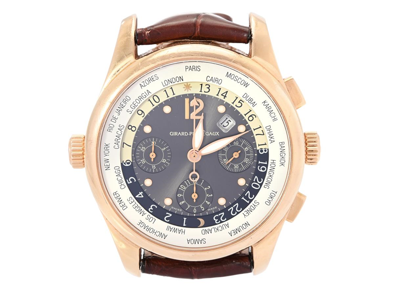 GIRARD-PERREGAUX, WW.TC "World Time Chronograph", Cal 3387, Movement no. 02017, Serial no. 873, Ref no. 4980, chronograph, men´s wristwatch, 43 mm, 18K pink gold, self winding, sapphire crystal (scratches/notch), date, 24-hour indicator, worldtimer, display caseback, leather strap, original buckle in 18K pink gold, approx. 2003, service case