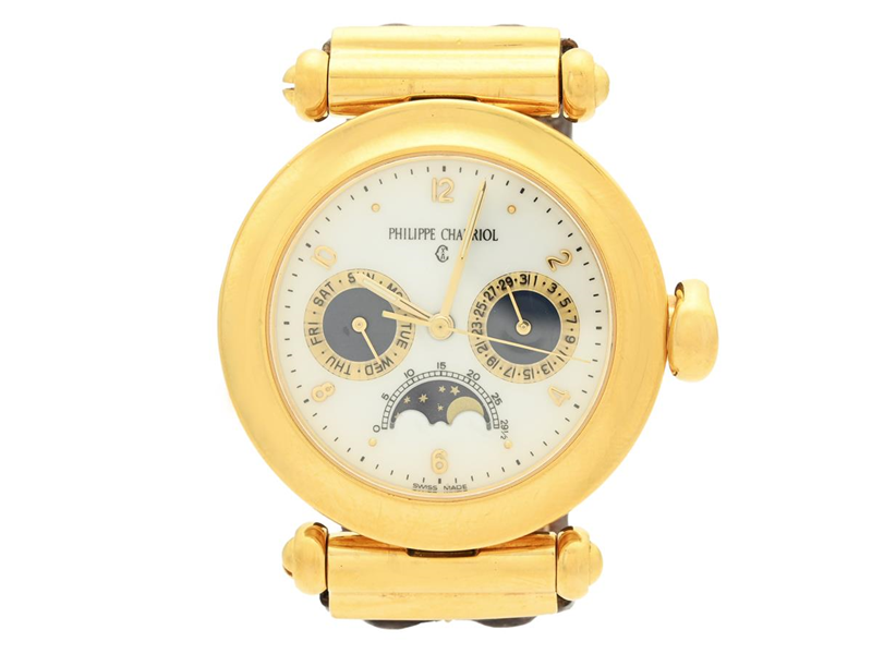 PHILIPPE CHARRIOL, Christopher Columbus, Case no. 37.9.3970, men´s wristwatch, 35 mm, gold plated, quartz, sapphire crystal, day, date, moonphase, integrated leather strap, original buckle, certificate, approx. August 1990.