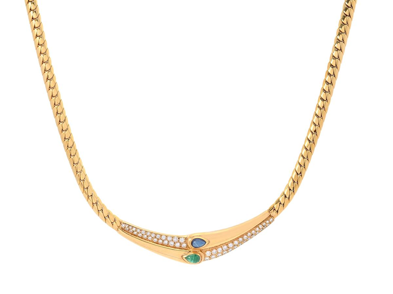 NECKLACE, 18K gold, pear shaped emerald and sapphire, 54 brilliant cut diamonds approx. 1,00 ctw, approx. TW/VS, length 43 cm, weight 50,6 g.