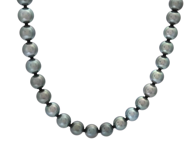PEARL NECKLACE, cultured Tahitian pearls, length 47 cm, 10,0-11,8 mm, weight 70,5 g, hidden clasp, some pearls with blemishes.