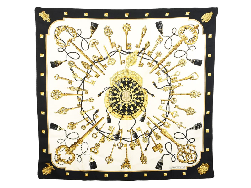 SCARF, HERMÈS, Les Cles, Cathy Latham, 100% silk, 86x90 cm, beige, black, yellow, stains.