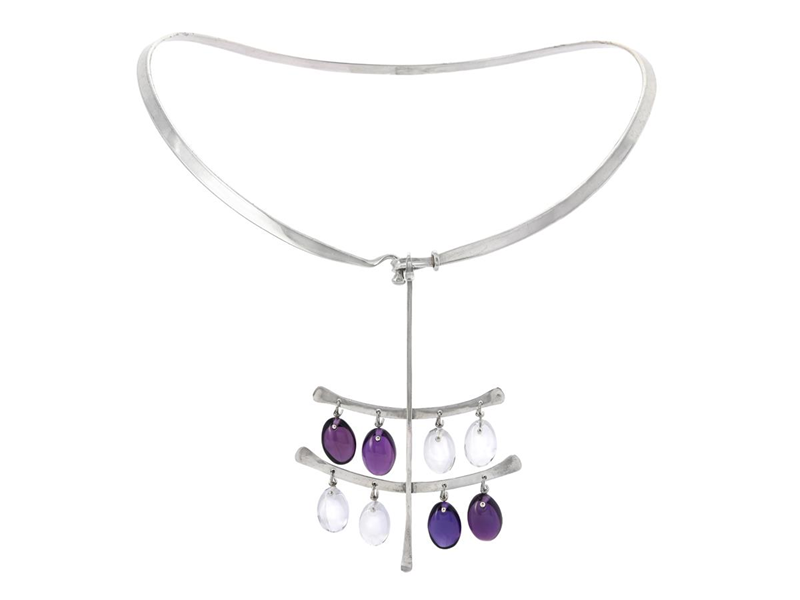 GEORG JENSEN, necklace, no 168, pendant, no 135, Drops, sterling silver, amethysts, rock crystal, Torun Bülow-Hübe, the pendant´s height 95 mm, inner measurement 13x16 cm, total weight 61,6 g.