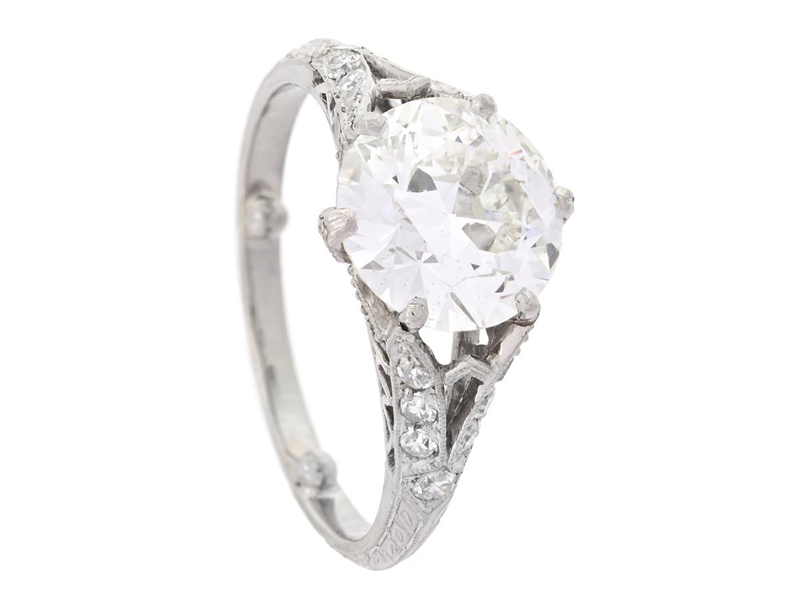 RING, platinum, transitional cut diamond approx. 2,41 ct, approx. Cr(J)/VS2, 16 single cut diamonds approx. 0,20 ctw, HRD jewellery report J250000121349, size approx. 16,5 mm, weight 4,2 g, altered ring size with beads soldered in the ring shank, center stone has small notches at the girdle, case.