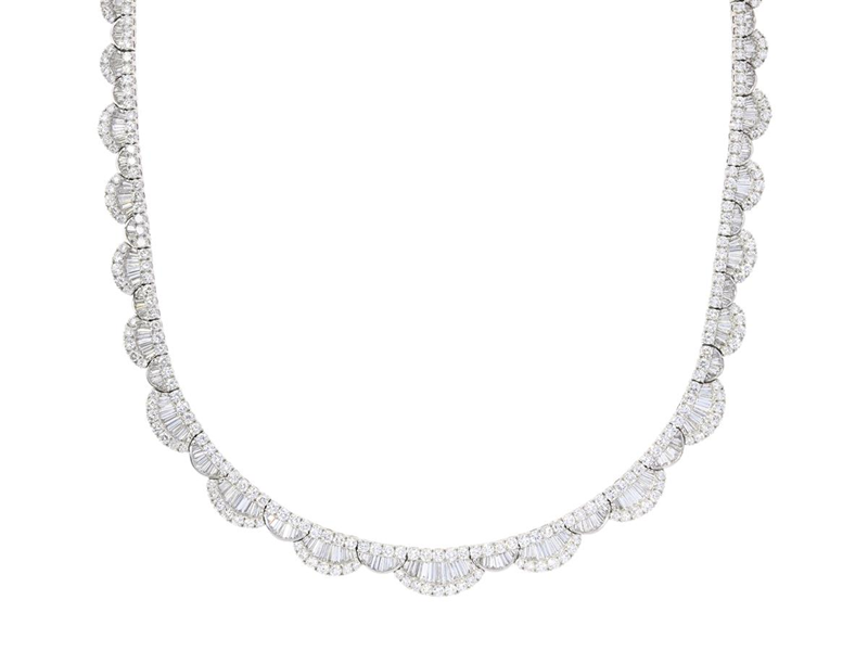 NECKLACE, 18K white gold, baguette-, trapeze- and brilliant cut diamonds approx. 31,10 ctw, approx. R-TCr/VS-P, length 40 cm, weight 91,5 g, a few diamonds has notches.