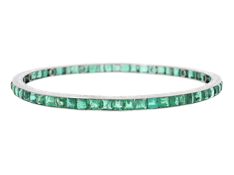 BANGLE, platinum, carré cut emeralds approx. 12,00 ctw, first half of the 20th century, size 6,3 cm, weight 17,7 g, several emeralds has notches and damages.