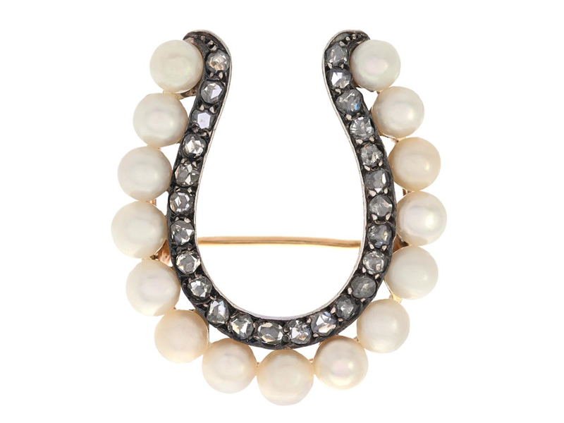 BROOCH, 18K rose gold/silver, oriental pearls 4,6-5,3 mm, GCS report 5786-2388, rose cut diamonds, antique, France, circa 1900, measurements 35x31 mm, weight 10,9 g, one pearl is cultured, some diamonds has notches and damages.