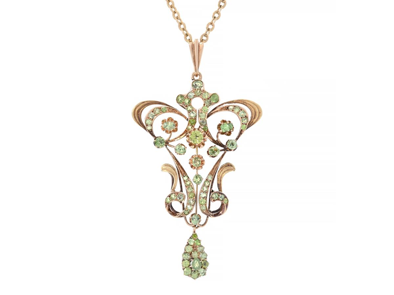 PENDANT, 14K gold, demantoides, antique, Jugend, Ivan Galkin, Russia, Kostroma 1898-1908, height 74 mm, weight 14,1 g, a few stones added later of which center stone and a smaller side stone are peridots, later chain in 14K gold from Finland 1972, length 62 cm, weight 8,9 g.
