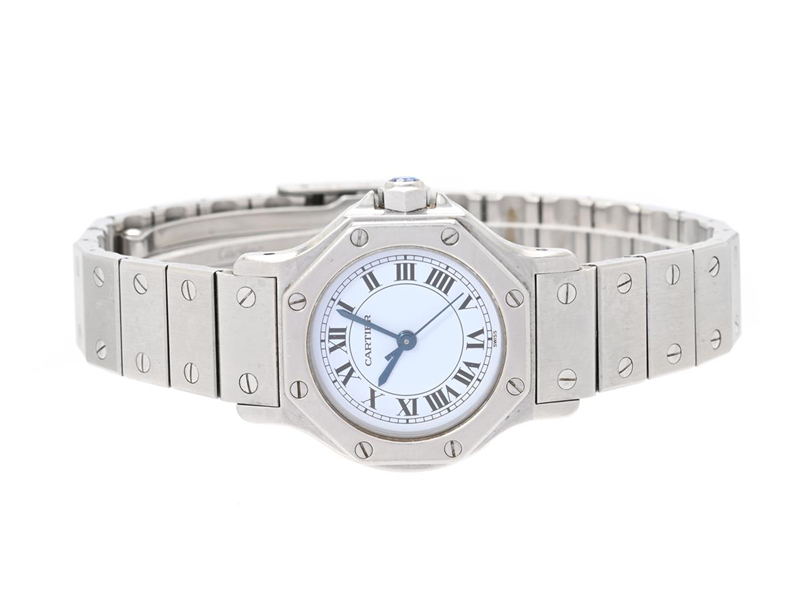 CARTIER, Santos Ronde, Case no. 090621134, ladies´ wristwatch, 24 mm, steel, self winding, sapphire crystal, integrated original bracelet, folding clasp, Ref no. 05/91, certificate, June 1991, box.