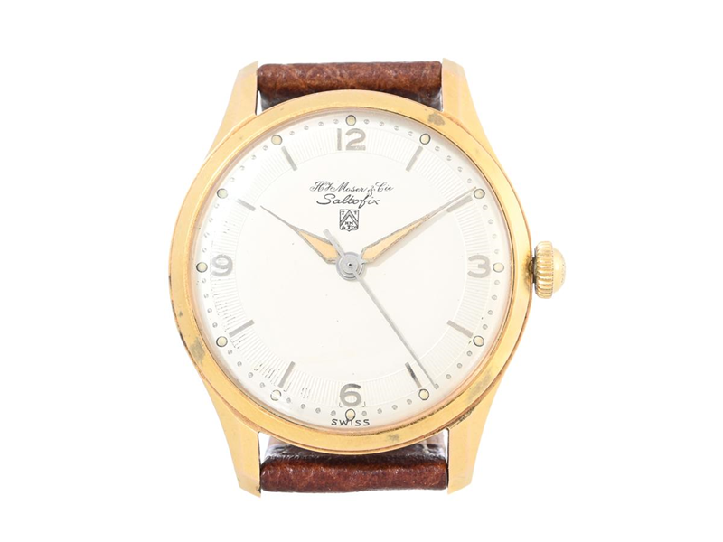 H.Y.MOSER & CIE, Saltofix, s.c. "Dead Beat", Cal Chezard 116, Movement no. 504187, Case no. 1633210, men´s wristwatch, 35 mm, gold plated, manual winding, plastic crystal, damaged dial, leather strap, approx. 1956.