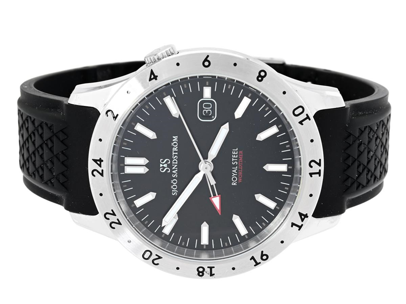 SJÖÖ SANDSTRÖM, Royal Steel, Worldtimer, Cal SS G14 (ETA 2893-2), Serial no. 1077, Case no. SS-1841-WT, men´s wristwatch, 41 mm, steel, self winding, sapphire crystal, date, 24-hour display, display caseback, integrated rubber strap, folding clasp, certificate, november 2023, box, paper box.
