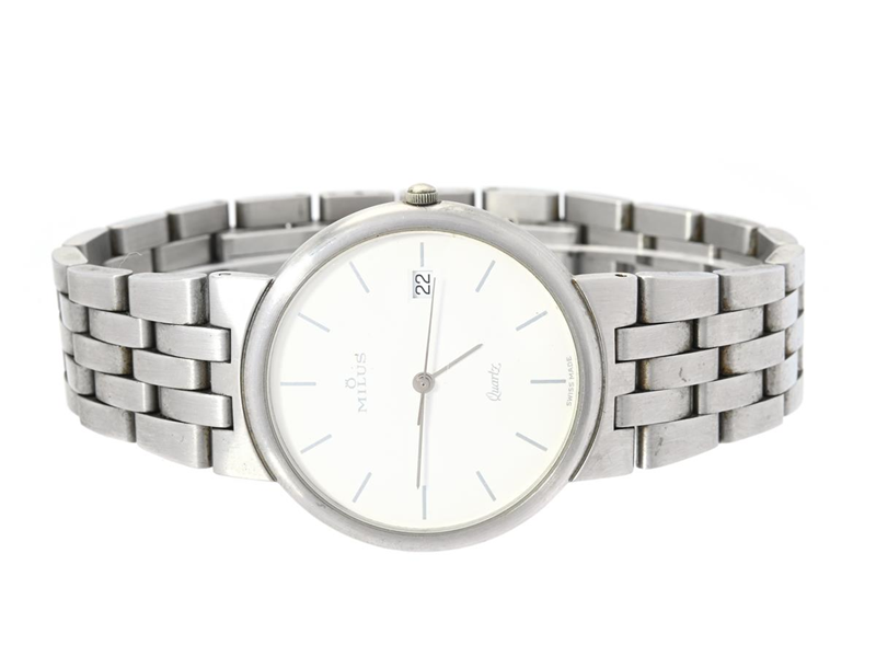 MILUS, "Projet Paul Junod", men´s wristwatch, 33 mm, Serial no. 0095, Case no. 510.012, steel, quartz, mineral crystal, date, integrated original bracelet, folding clasp, approx. 2000.