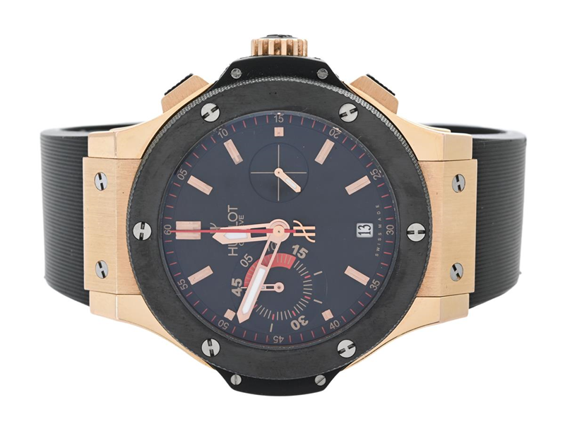 HUBLOT, Geneve, Big Bang, "UEFA 2008 LTD", Cal ETA 7750, No. 03/500, Ref no. 318.PM.1123.RX.EUR08, Case no. 715918 / 318, chronograph, men´s wristwatch, 44 mm, 18K red gold/ceramic, self winding, sapphire crystal, date, cuvett in titanium, integrated rubber strap, folding clasp in PVD/red gold, certificate, December 2010, box, paper box. Limited and numbered (No. 03/500).