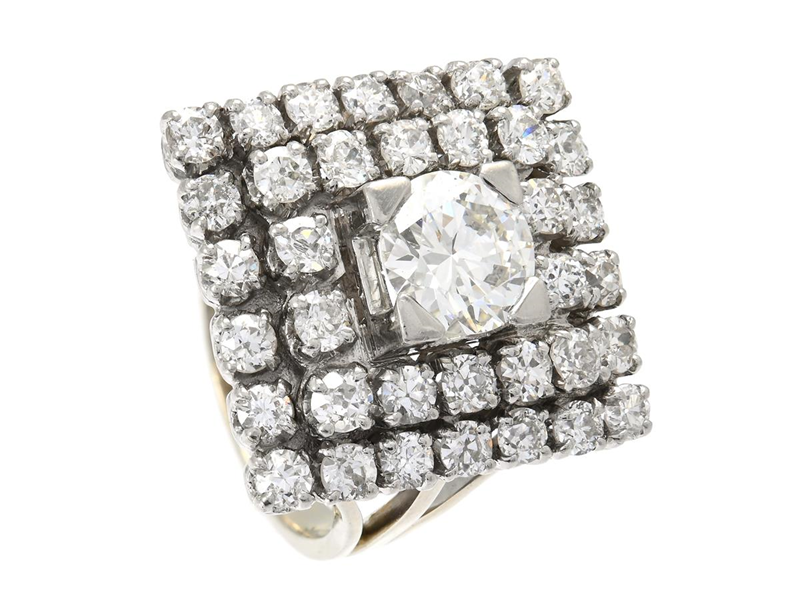 RING, 18K white gold/platinum, brilliant cut diamond approx. 1,20 ct, approx. TCr(I)/VS1, old European- and older swiss cut diamonds approx. 2,30 ctw, approx. R-TCr/VS-P, France, later half of the 20th century, size 17,25 mm, weight 13,3 g, center-stone has small culet facet and worn facet edges, several side stones has notches and damages, case.