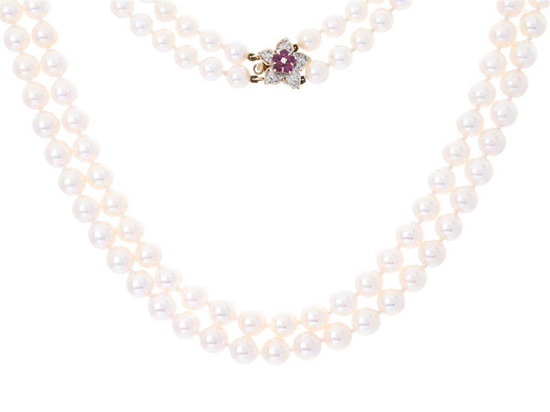 PEARL NECKLACE, cultured pearls, approx. 6,0- 6,3 mm, 2- strand, clasp 14K gold, rubies, brilliant cut diamonds approx. 0,08 ctw, length 47 cm, weight 48,3 g. case from Asprey.