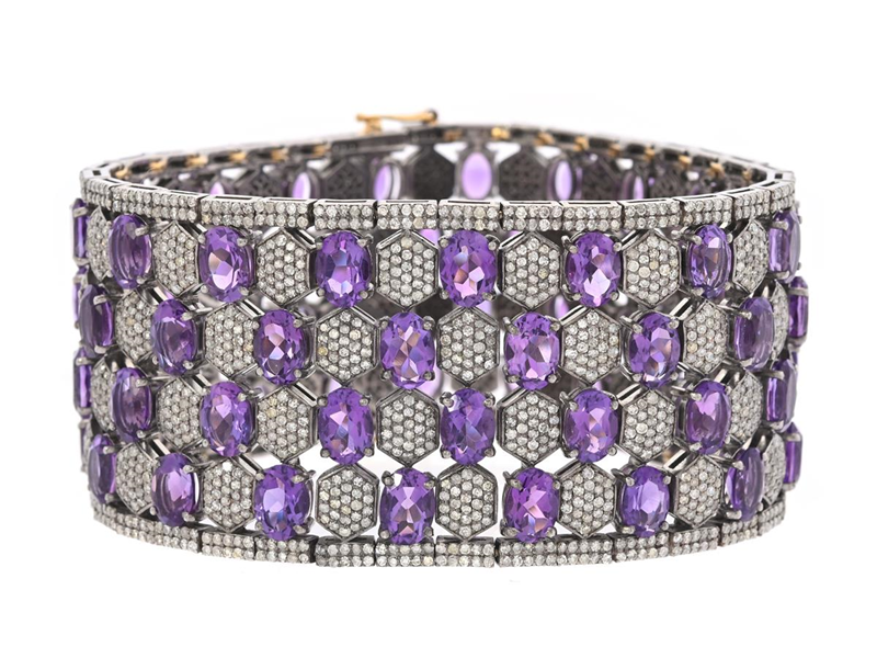 BRACELET, silver/14K gold, oval cut amethysts approx. 47,2 ctw, single cut diamonds approx. 10,00 ctw, approx. Cr-Yellow/SI-P, width 33 mm, length 18,5 cm, weight 81,0 g, some diamonds with damages and notches.