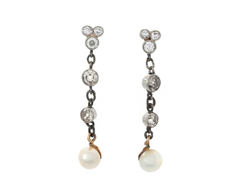 EARRINGS, 18K guld/platina/silver, pearls 5,4 mm, old European cut diamonds approx. 0,74 ctw, approx. TW-TCr/SI-P, weight 3,2 g, residues of solders, notches, residue of glue on pearl, case.