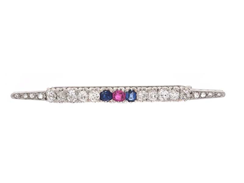 BROOCH, 18K white gold, antique cut diamonds approx. 1,40 ctw, approx. W-Cr/SI-P, rose cut diamonds, sapphires, ruby, Sam Pettersson, Linköping 1901, weight 6,3, skew brooch-pin, notches and damages.