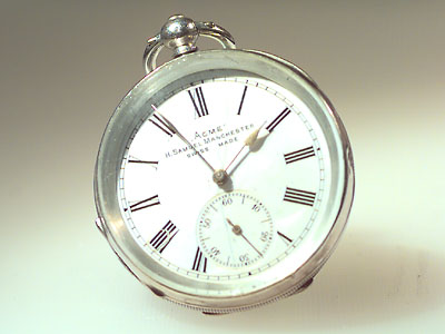 ACME, H. Samuel Manchester, pocketwatch, silver, dents, damaged dial, 1880s.
