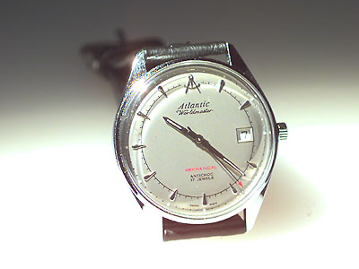 ATLANTIC, Worldmaster, men´s wristwatch, metal case, manual wind, plastic crystal, date, leatherstrap, approx 1960, mint.