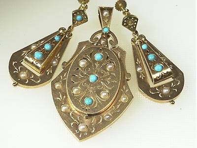 PENDANT & EARRINGS. 18K gold, 1800s, turquoises and genuine pearls, place for photo on reverse, screw-fittings, W=20,6 gr.1 stone missing.