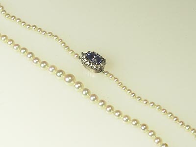 PEARLNECKLACE, graduated, cultured pearls 3-7,3 mm, length 47½ cm, ceylon sapphire approx 2,30 cts + white stones in silverclasp.