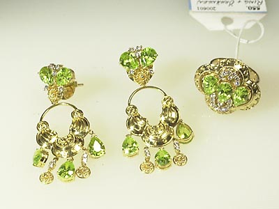 RING + EARRINGS in 14K gold, brilliant-cut diamonds approx 0,85 ct of total weight, W/SI, and green stones, push-back, ringsize 18, weight 30 gr of total weight