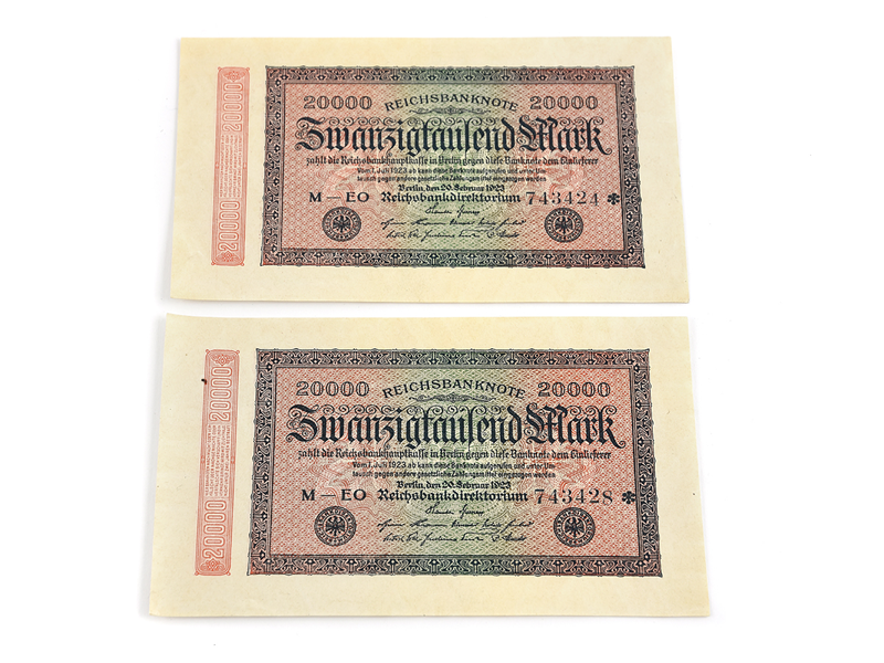 2 BANK-NOTES, 20000 mark, stjärnmärkta, 20/2-1923, Germany, quality approx 1+/01 (one has a minor tear, the other a minor discolouration and a folded corner).