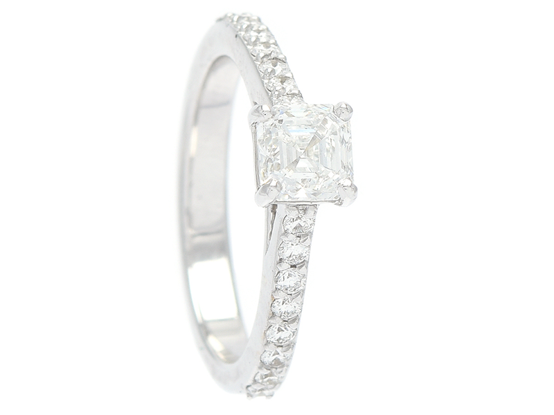 RING, 18K white gold, asscher cut diamond 0,90 ct, River(E)/VS2, HRD laser inscription 190000041502, 16 brilliant cut diamonds approx 0,33 ctw, approx TW-W/VS size 17,25 mm, weight 4,7 g, stone envelope enclosed.