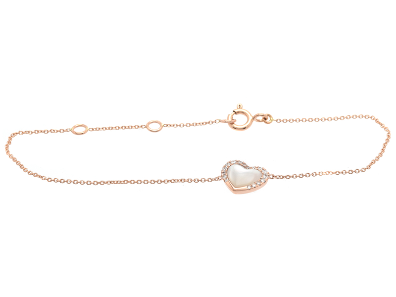 BRACELET, 18K rose gold, heart with mother-of-pearl and 17 brilliant cut diamonds 0,09 ctw, approx W(H)/SI, length 15/17/18 cm, weight 1,5 g.