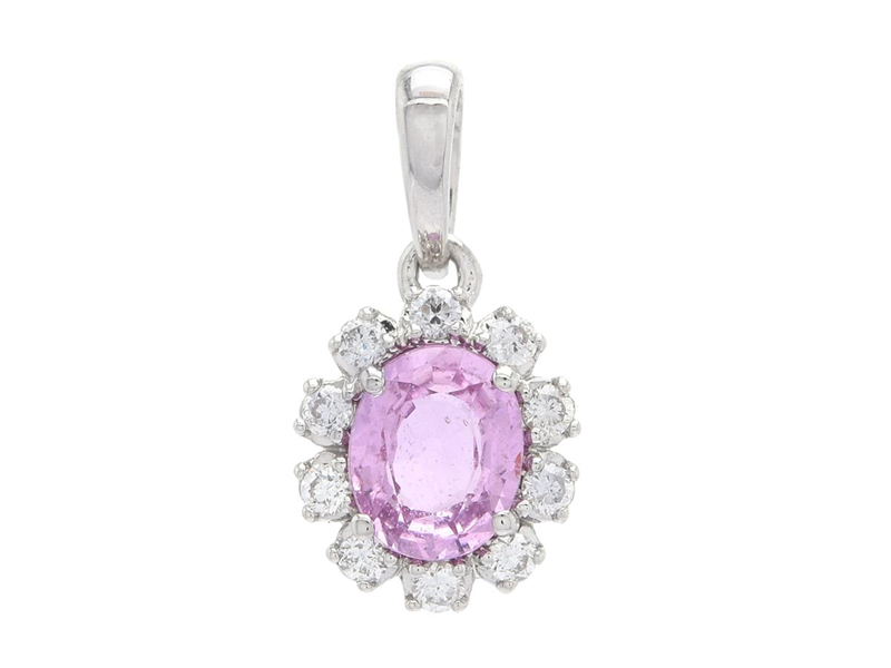 CLUSTER-PENDANT, 18K white gold, oval-cut pink sapphire approx 0,41 ct, 10 brilliant cut diamonds approx 0,08 ctw, approx W/SI, height 8,0 mm, weight 0,5 g.