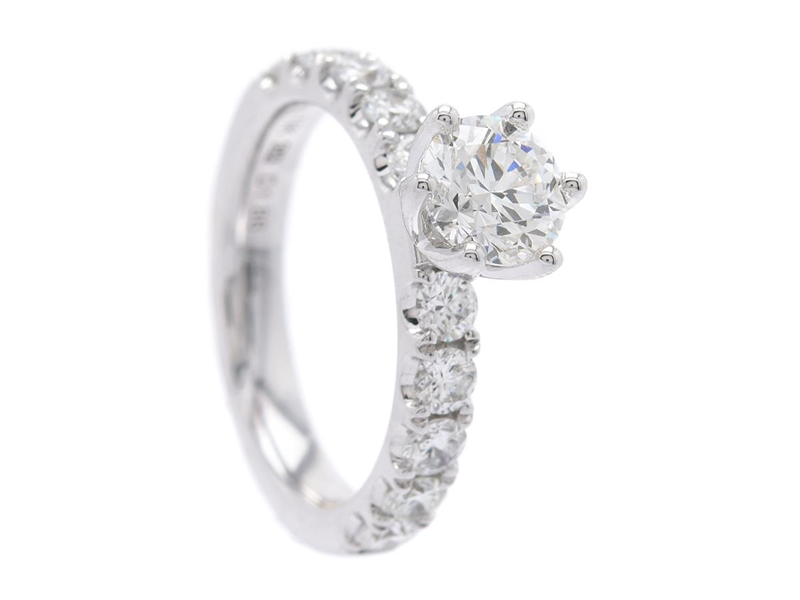 RING, 18K white gold, brilliant cut diamond 1,00 ct, TW(G)/VS2, laser inscription GIA certificate 6381540283, 10 brilliant cut diamonds approx. 0,86 ctw, approx. TW/VS, size 16,25 mm, weight 6,0 g.