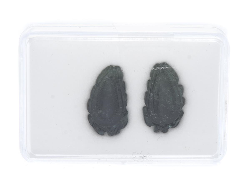TOURMALINES, one pair, 23,94 ctw, green, carved, small notch and inclusions that reaches the surface.