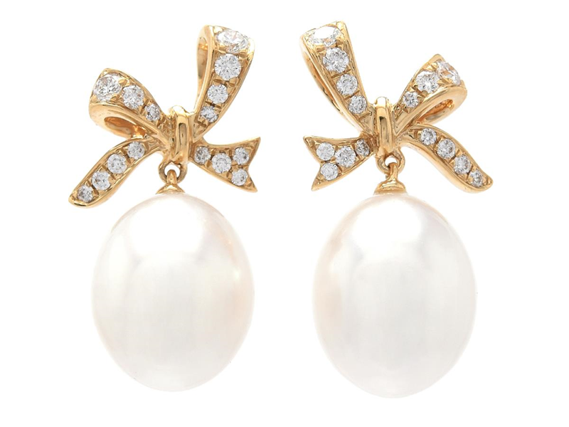 PEARL EARRINGS, 18K gold, cultured freshwater pearls, drop shaped approx 8 mm, ribbons with 30 brilliant cut diamonds approx 0,20 ctw, approx TW/VS, pushback, length 18 mm, weight 4,1 g.