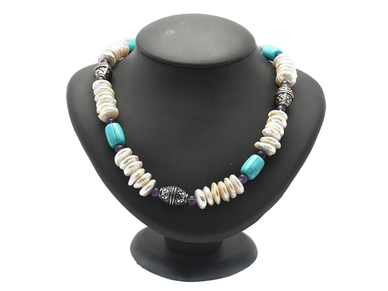 NECKLACE, cultured button shape freshwater pearls, howlite, amethyst, silver-tone clasp and hardware, length 47 cm.