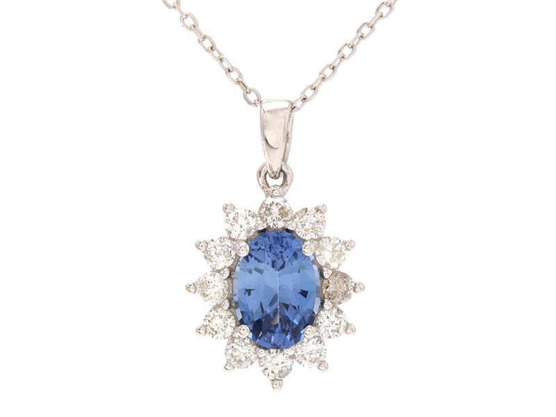 PENDANT/CHAIN, 18K white gold, oval-cut blue sapphire approx. 1,12 ct, 12 brilliant cut diamonds approx. 0,41 ctw, approx. TW-Approx./P, height 1,9 cm, mariner´s chain 41 cm, weight 2,6 g, the sapphire has small notch.