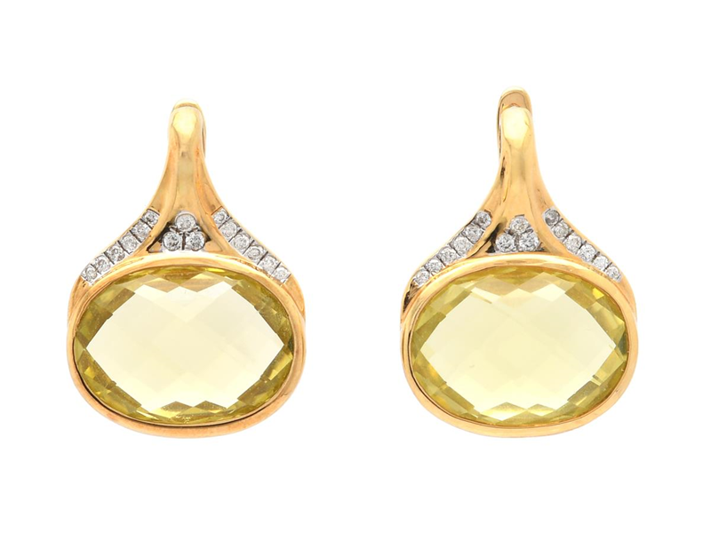 EARRINGS, 18K gold, oval faceted lime quartz approx. 13,88 ctw, 30 brilliant cut diamonds approx. 0,18 ctw, approx. W-Cr/P, pushback, height 22 mm, width 16 mm, weight 7,1 g, several diamonds with inclusions that reach the surface.