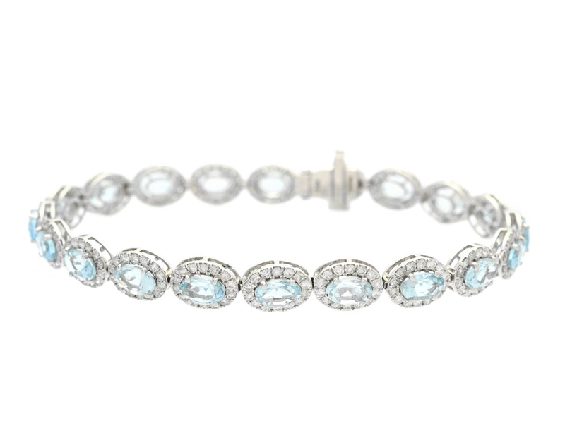 BRACELET, 18K white gold, 20 oval cut aquamarines approx. 8,58 ctw, 280 brilliant cut diamonds approx. 3,12 ctw, approx. TW-Cr/P, length 18,5 cm, weight 12,5 g, some diamonds with small notches.