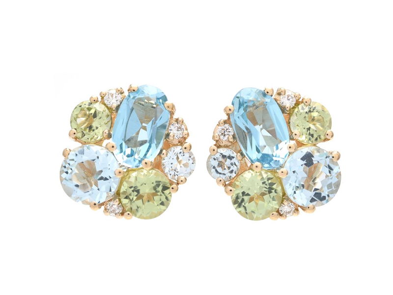 EARRINGS, 18K gold, 6 blue topazes approx. 1,05 ctw, 4 peridots approx. 0,40 ctw, 6 brilliant cut diamonds approx. 0,03 ctw, approx. W/SI, pushback, measurements approx. 8,0 x 8,0 mm, weight 1,5 g.