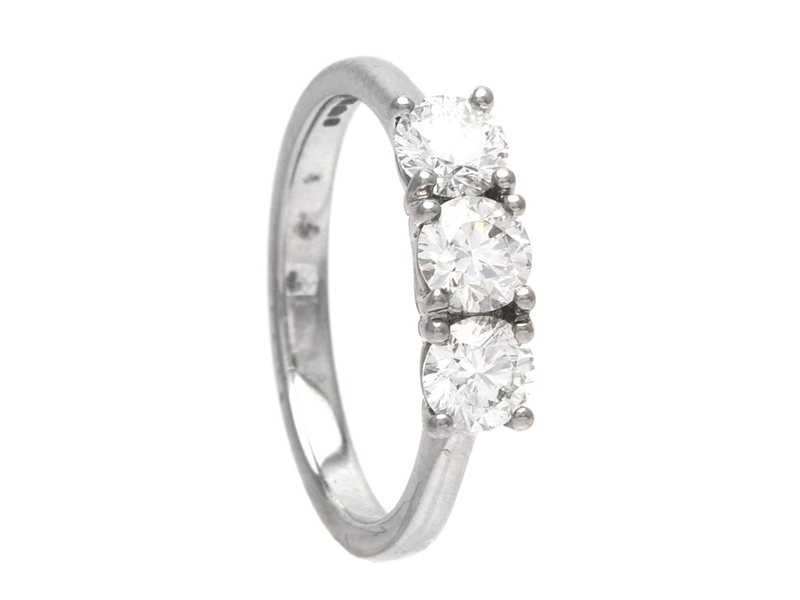 THREE STONE RING, platinum. 3 brilliant cut diamonds approx. 1,04 ctw, approx. TW(F)/SI1, GIA laser inscription 6193930389 and dossier, 2314975084, 2195931954, size 16,75+ mm, weight 4,7 g.