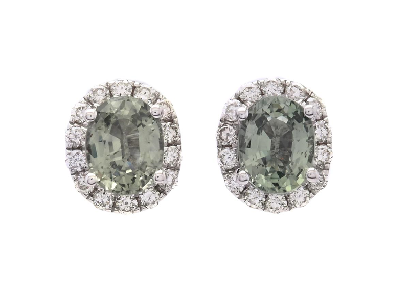 EARRINGS, 18K white gold, 2 oval faceted green sapphires approx. 1,05 ctw, 28 brilliant cut diamonds approx. 0,17 ctw, approx. W-Cr/VS-SI, pushback, measurements 7,0 x 6,0 mm, weight 1,6 g, some small notch.