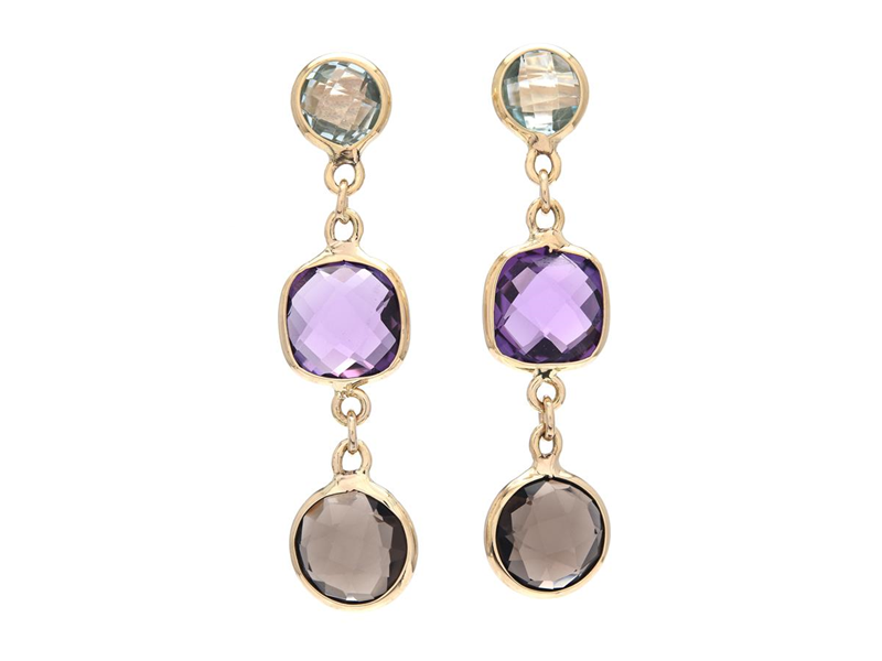 EARRINGS, 18K gold, faceted blue topazes, amethysts and smoky quartz, pushback, length 37,0 mm, weight 4,1 g.